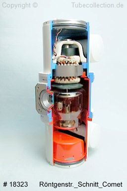 ![]() Alle Bauteile im Strahler liegen zur Ableitung der Wärme in Öl. Ganz links (rot) befindet sich ein Ausdehnungsgefäß, das die Ausdehnung des Öls bei Erwärmung aufnimmt. In der Mitte die Drehanoden-Röntgenröhre mit dem Strahlenausgang nach oben. Rechts der Antriebsmotor für die Drehanodenröhre. |