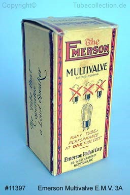 Die Röhre wurde 1926 heraus gebracht von: Emerson Radval Corp., 25 West 43rd Street, New York, N.Y. Sie hat 3 Systeme in einem Kolben. Auf dem Foto sind wegen der nur kleinen Öffnung in der Verspiegelung jedoch leider nur 2 Systeme sichtbar. |