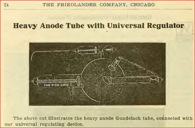 Sehr verwundert darf man darüber sein, dass Friedlander Röntgenröhren von Gundelach, Gehlberg importierte, die mit dem Osmo-Regenerator nach DRP 103 100 ausgetattet sind. Warum hier Gundelach Dessauer Tubes steht ist merkwürdig. Es handelt sich hier um die original Gundelach Patentröhren Type a bis g.