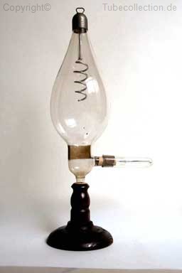 Gasfunkenstrecken wurden in frühen Jahren, als man noch Induktoren zur Spannungsversorgung für Röntgenröhren benutzte, verwendet. Da bei Induktoren gegenpolige Öffnungs- und Schließströme auftreten, schaltete man beim Betrieb von Röntgenröhren meist ‘Ventilröhren’ vor, die dafür sorgten, dass nur die eine Halbphase des Induktionsstromes wirksam wird. Anderenfalls hätte der Rückstrom die Antikathode zerstört und unkontrollierte Entladungen („Schließungslicht“) verursacht. Als ‘Ventilröhren’ dienten anfangs einfache Funkenstrecken zwischen Spitzen- und Plattenelektrode, die zur Schalldämpfung in einem Glaszylinder eingeschlossen waren. Um chemische Reaktionen mit der Luft und die Korrosion des Elektrodenmaterials zu verhindern, schlägt das 1917 erteilte Deutsche Reichspatent 299593 der Reiniger, Gebbert & Schall AG vor, die Funkenstrecke in einen abgeschmolzenen, CO2- gefüllten Glaskolben zu legen. Der Elektrodenabstand legt die Arbeitsspannung fest. D.R.P. 299593 vom 25. Juli 1917. - Paul Rønne, Arnold B.W. Nielsen, Development of the Ion X-Ray Tube. Die in meiner Sammlung vorhandene Gas-Funkenstrecke trägt keine Herstellerangabe. Sie stammt aber vermutlich von der Firma C.H.F. Müller in Hamburg, die während des ersten Weltkriegs die Röhrenproduktion für das Erlanger Stammhaus von Reiniger, Gebbert & Schall übernommen hatte. |