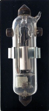 Die nachfolgende E.414 ist vermutlich eine Experimental-Röhre. Der Buchstabe "E" dürfte für "Experimental" stehen. Sie trägt die Nr.10 und eine zusätzliche Markierung 1V. Sie ist ferner deutlich kleiner als die V24. Die nachfolgende ist eine R3B Admirality. Da sie genauso aussieht wie die V24 ist zu vermuten, dass es sich um die Bezeichnung der Marine für die V24 handelt. Die dann folgende FE1. Round dachte, die schädliche Kapazität zwischen den Elektroden nur noch innerhalb der Röhre reduzieren zu können. So baute er ein zusätzliches Maschengitter zwischen Steuergitter und Anode und belegte dies mit einer positiven Spannung. Die Elektronen wurden nun auf dem Weg zur Anode beschleunigt und durch das zusätzliche Gitter hindurchgezogen. Die FE1 ist größer als die V24. Sie hat etwa 25mm Außendurchmesser und eine Länge von ca. 90mm. Sie benötigt für den Faden 4,5V und 1,5A. Die Anodenspannung liegt bei 20---100V. Die FE1 wurde später von der FE2 abgelöst. Sie war deutlich kleiner. Es würde später auch noch eine FE3 hergestellt. |