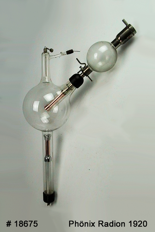 Diese Röhre hat die Aufschrift "Phönix Radion". Es ist eine wassergekühlte Röhre, etwa 1921 entstanden. Sie muss ziemlich genau in diese zeit bei der Phönix GmbH, Rudostadt, hergestellt worden sein, denn kurz danach hat man sich ausschließlich auf Röhren mit Glühkathode konzentriert, die über die Veifa vermarktet wurden. Der Begriff "Radion" kommt wie folgt zustande. Die Odelga Medizintechnick und die Watt Elektrizitätsgesellschaft gründeten 1920 die Radion mit Sitz in Wien. 1923 kaufte die INAG AG Erlangen, eine von RGS gegründete Aktiengesellschaft, die Radion. Über die 1916 von RGS übernommene Veifa, die 1920 die Phönix gründete bestand nun eine gewisse Zusammenarbeit. Daher Phönix-Radion. Phönix hatte eigentlich keine eigene Verkaufsgesellschaft, das lief über die Veifa bzw. RGS. Insofern dürfte es sich hier um eine entsprechende Rarität aus dem Jahre 1923-24 handeln. Die extrem lange Bauform weist auf den Betrieb mit recht hoher Spannung hin. Die Antikathode ist von einer Glashülse umgeben, um die Zerstäubung beim Schließungslicht am Funkeninduktor zu reduzieren. Oben am senkrechten Anodenhals ist ein Paladium-Röhrchen eingeschmolzen. Wird es mit einer Flamme zum Glühen gebracht, kann Wasserstoff durch das Metall hindurch in die Röhre gelangen und den Druck regulieren. |