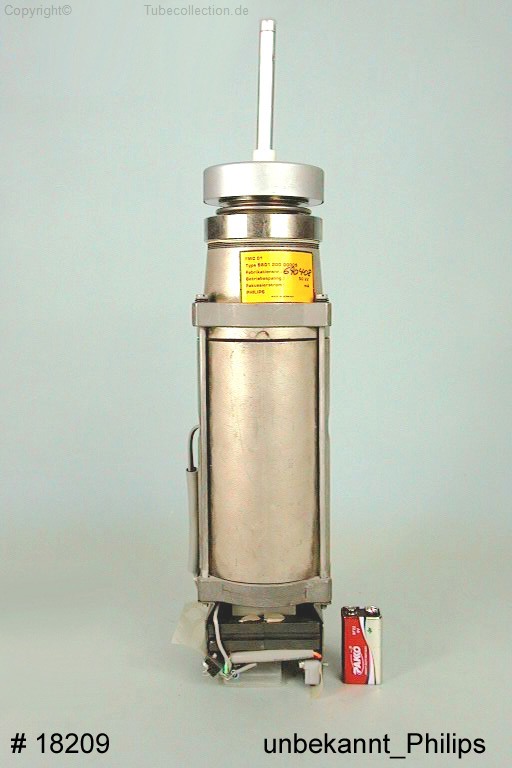 Es handelt sich vermutlich um eine Röntgenröhre aus dem "stat-Oralix" Röntgengerät aus den 1970er Jahren für Zahnärzte. Damit machte man sogenannte Panorama-Aufnahmen. Der dünne runde Stab wurd in den Mund geschoben. Von ihm geht in alle Richtungen Röntgenstrahlung aus. Der Film kommt in eine leicht flexible gebogene Cassette, die der Patient von außen gegen die Zähne bzw. den Kiefer hält. So wird der Film von innen aus dem Mund heraus belichtet. Trotz genauer Code-Bzeichnung kann oder will Philips Hamburg dazu nichts sagen. Das Philips Museum in Eindhoven NL kann ebenfalls nicht weiterhelfen. Der entscheidende Hinweis zu weiteren Recherchen kam von Siemens Medizinmuseum in Erlangen. Ergebnisse der Recherchen siehe am Ende dieser Seite! |