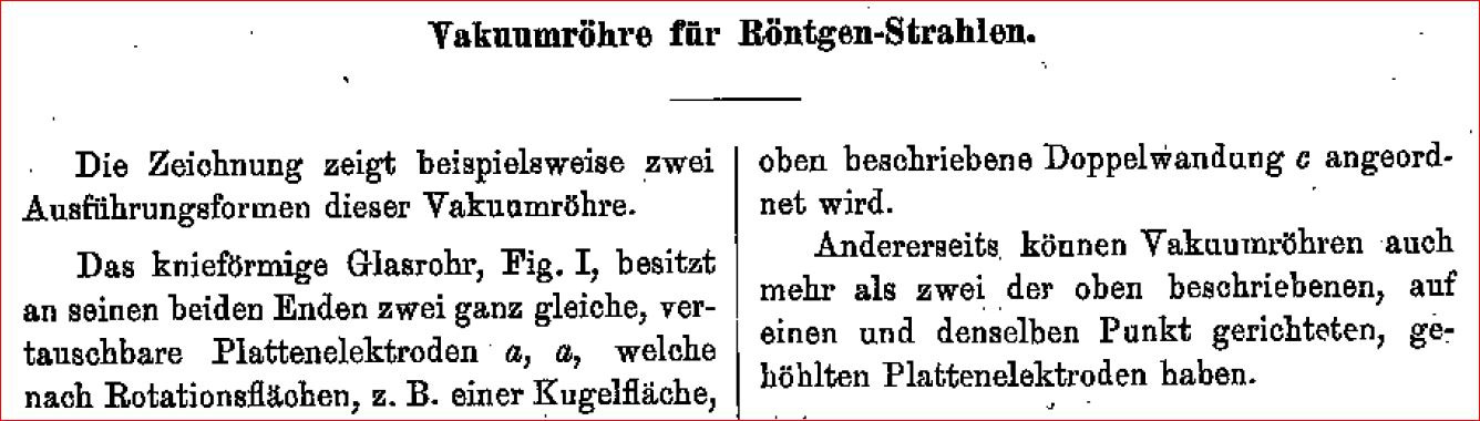 Irgendwie hat die Zehnder-Röhre in meiner Sammlung nicht viel mit dem Patent gemeinsam. Sie besitzt bereits die übliche Antikathode, die aber im Patent nicht weiter erwähnt wird. Somit ist davon auszugehen, dass meine Röhre erst kurz nach der Patenterteilung entstanden sein muss. Andererseits aber auch nicht viel später, weil dann bereits andere Ausführungsformen mit Hilfsanoden bestanden, die von der Kugel der Röhre ausgingen.
